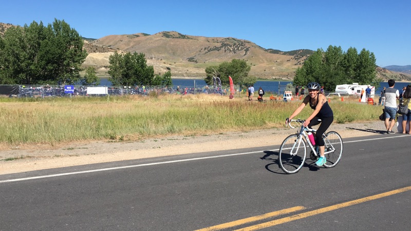 I found my flip flops easily and jogged to my bike. I had trouble getting my wetsuit off. The suit was like a giant suction cup. I slipped my cap and goggles off and took my timing chip off my ankle so I wouldn’t have to try to slide the wet suit over it. I put my helmet on, hopped on my bike and I was off!